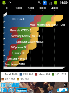 Rezultat testa AnTuTu Benchmark je 1854 točk, Quadrant standard 1080 točk in Vellamo 334 točk. AnTuTu Tester baterijskega testa je pokazal rezultat 789, baterija se je segrela na 35°C, multi touch pa zazna 2 prsta.