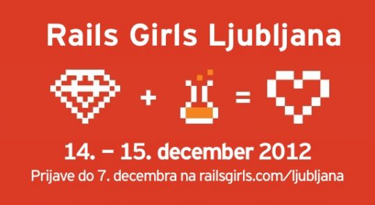Prva Rails Girls Ljubljana delavnica bo potekala 14. in 15. 12. 2012 na lokaciji TSstartup, Vojkova cesta 45, Ljubljana. Prijava je možna do 7. decembra 2012. Obrazec je TUKAJ. 10. decembra pa bodo izbrali udeleženke.