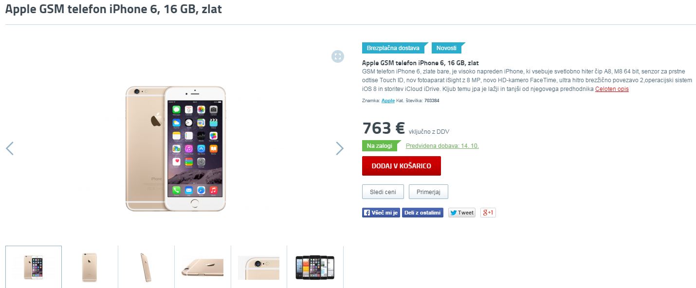 Apple iPhone 6 16GB je na voljo tudi v spletni trgovini mimovrste.com. Kot je razvidno iz spletne trgovine na voljo zgolj v 16GB različici in v zlati barvi. Cena telefona je 763€ in to brez dodatnih stroškov vezave ali kakšnih drugih stroškov.