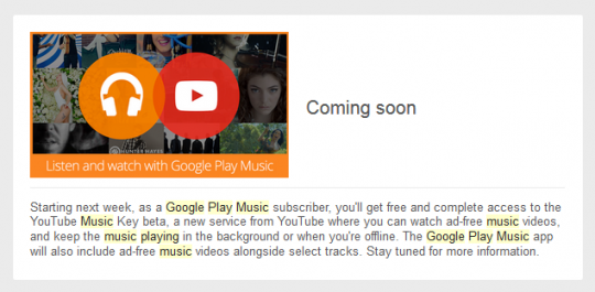 Google je sedaj objavil, da bodo vsi naročniki na Google Play Music All Access imeli dostop do Music Key beta, ki na YouTubu omogoča gledanje videospotov brez oglasov, predvajanje glasbe v ozadju ali v offline načinu. Hkrati pa bo Google Play Music aplikacija vsebovala videospote brez oglasov pri določenih pesmih.