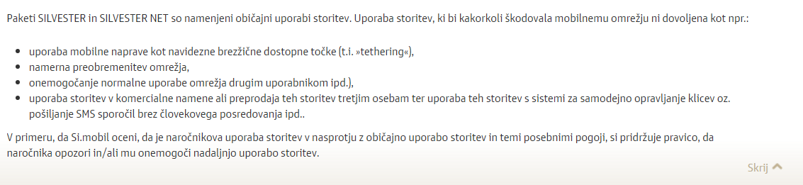 Če Simobil teheringa ne omejuje oz. za to sploh nima tehničnih rešitev oz. naprav in tega ne namerava izvajati, zakaj bi to sploh pisal v splošne pogoje. Čisto enostavno bi lahko zapisali nekaj takega kot pri paketu All Inclusive: »kakršnakoli uporaba storitev, ki bi lahko škodovala delovanju, integriteti, kvaliteti ali varnosti Simobilovega omrežja ali omrežja Si.mobilovega roaming partnerja, ni dovoljena (npr. preobremenitev omrežja, onemogočanje normalne uporabe omrežja drugim uporabnikom, itd.)«. Na tak način bi se izognili čisto vsem težavam. Uporabnike pa bi lahko kako drugače obveščali o posledicah tetheringa za njihovo porabo mobilnih podatkov.