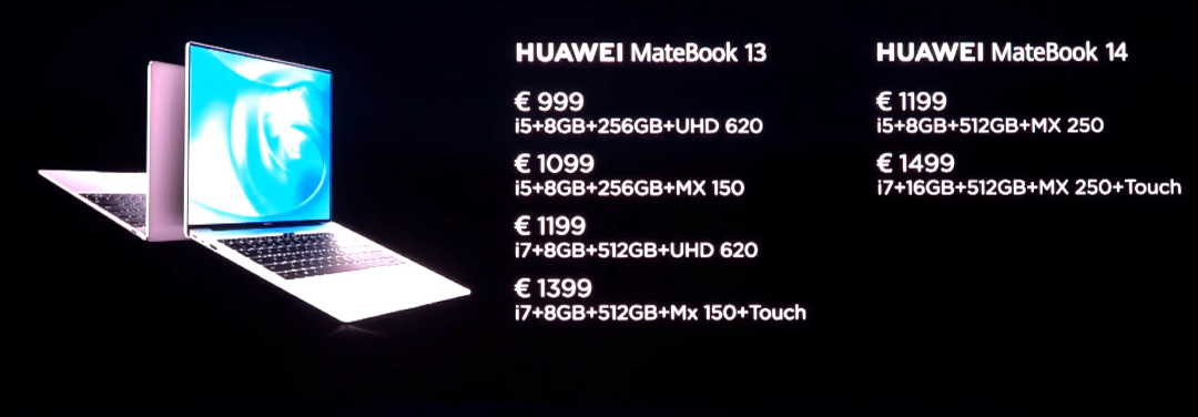 Oba prenosnika naj bi bila na trgu od aprila 2019. Priložen bo 65W polnilec. Cena za Huawei MateBook X Pro 2019 v konfiguraciji (i5+8GB+512GB+MX 250+Touch) bo 1.599€, v konfiguraciji (i7+16GB+1TB+MX 250+Touch) pa 1.999€. Za Huawei MateBook 14 v konfiguraciji (i5+8GB+512GB+MX 250) bo treba odšteti 1.199€, za konfiguracijo (i7+16GB+512GB+MX 250+Touch) pa 1.499€.