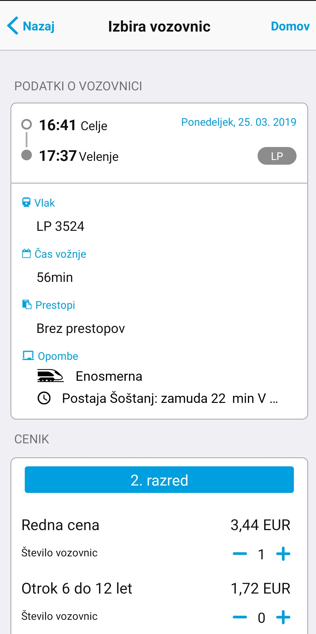 Star spletni iskalnik povezav zapiše, da ima potnik na tej relaciji prestop in sicer na avtobus, mobilna aplikacija pa tega trenutno še ne kaže.