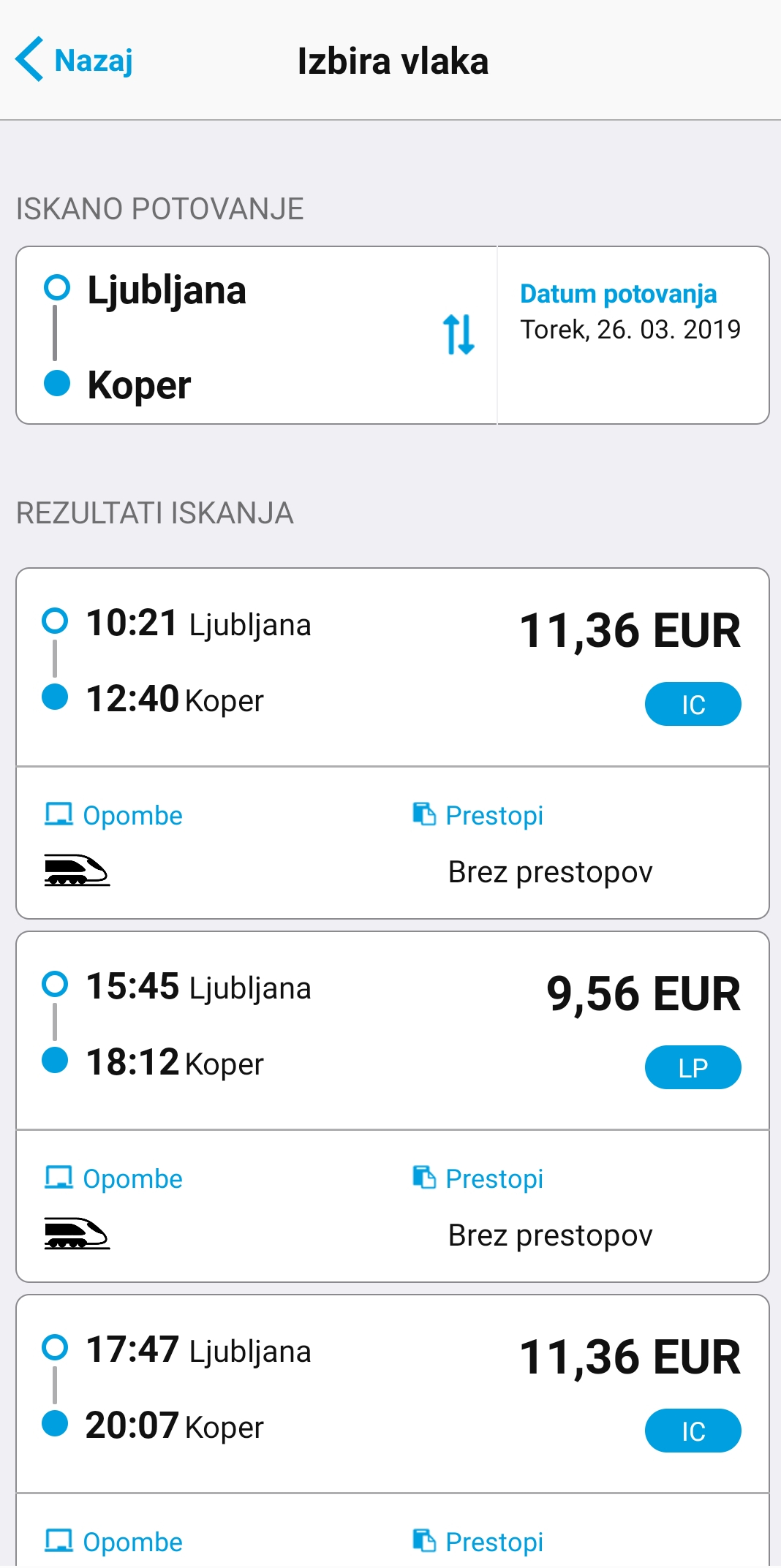 Žal pa seznam ovir, predvsem gre tukaj za nadomestne prevoze, še ni bil vgrajen v sistem nakupa vozovnice, kar bi bilo prav tako zelo koristno. Predvsem pa, ker imajo na spletni strani to zelo dobro rešeno. Tako da jih ta del implementacije še čaka, saj bodo na tak način tudi pravilno prikazani prestopi. Spodaj je primer vožnje iz Ljubljane v Koper.