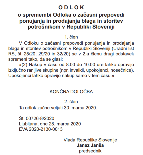 Vlada RS je s spremembo odloka iz 19. marca 2020 uvedla prednost nakupovanja za ranljivejše skupine med 8.00 in 10.00. Kot primer ranljivejših skupin so navedli invalide, upokojence in nosečnice. Z včerajšnjo spremembo pa so 2.a člen v drugem odstavku spremenili tako, da se glasi: