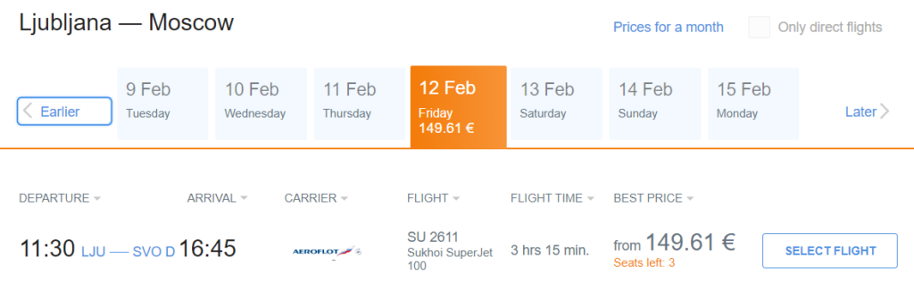 Do konca marca 2021 bo Aeroflot letel 1x tedensko