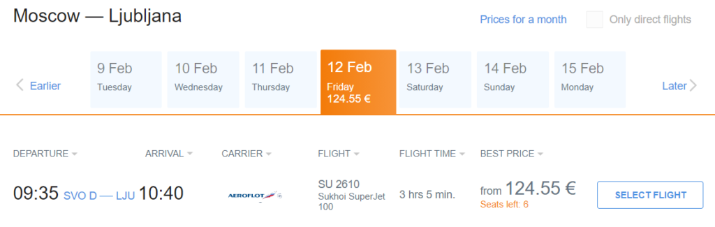 Aeroflot ponovno vzpostavlja letalsko povezavo Ljubljana – Moskva. Sukhoi SuperJet 100 bo na Brnik priletel danes 12.2.2021 predvidoma ob 10.40. To bo po 17.3.2020, ko so začasno prenehali leteti, prvi let letalske družbe Aeroflot na liniji Ljubljana – Moskva. Na ljubljanskem letališču zdaj štirje letalski prevozniki, Lufthansa, Turkish Airlines, Air Serbia in Aeroflot.