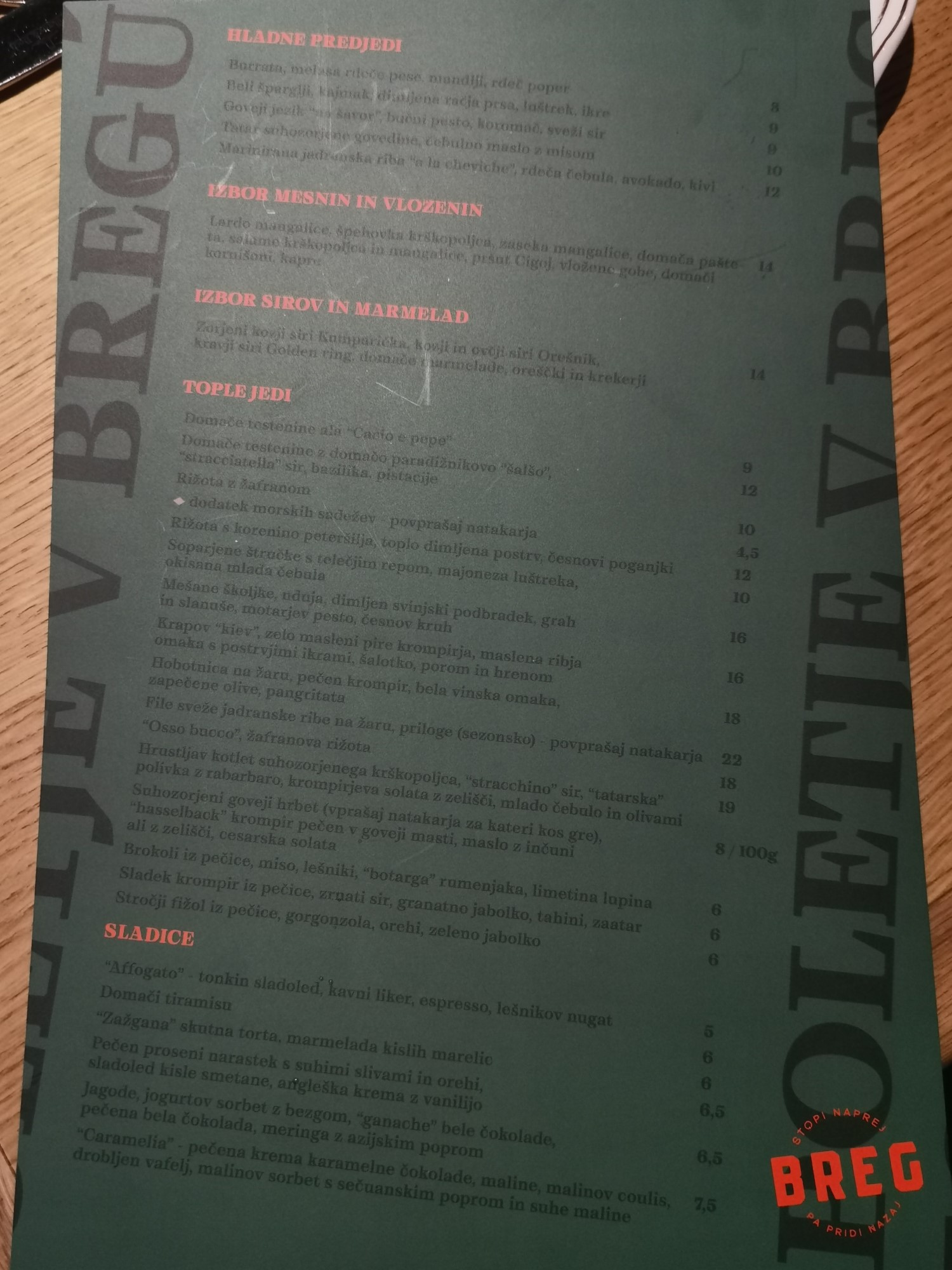 Jedilnik restavracije Breg vsebuje mastno in slastno