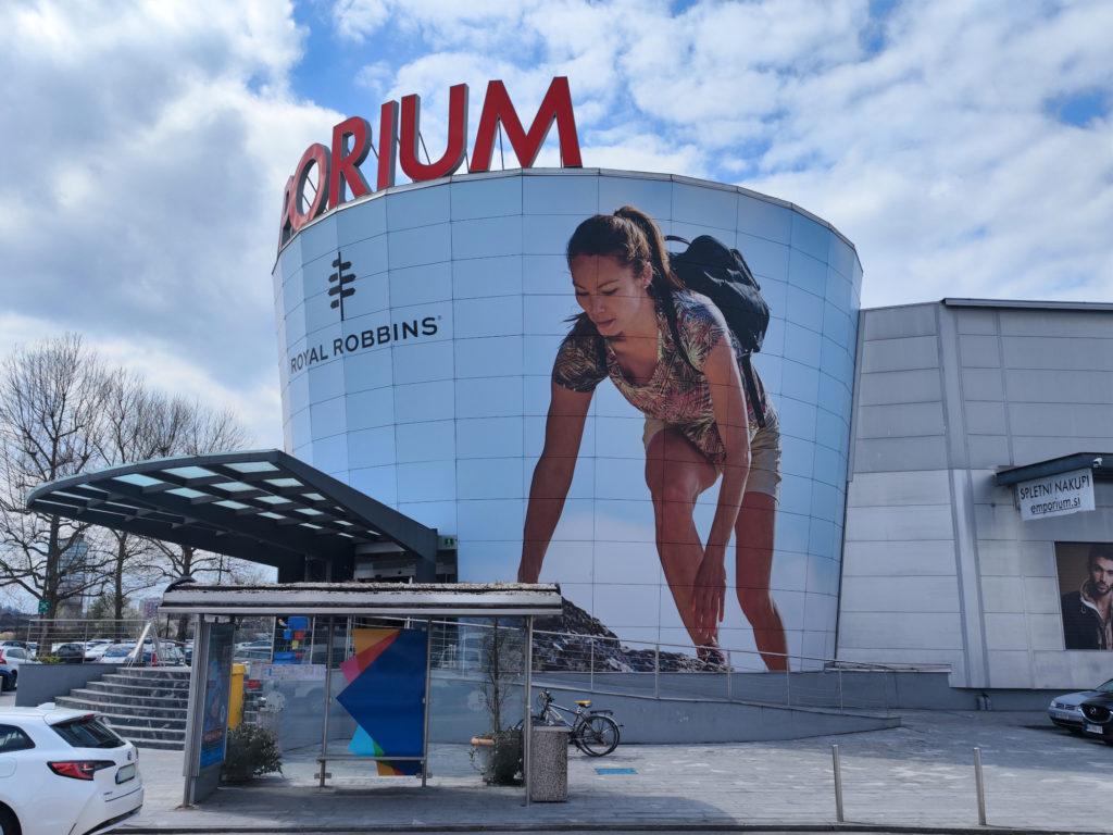Royal Robbins Slovenija z velikim oglasom na pročelju trgovine Emporium
