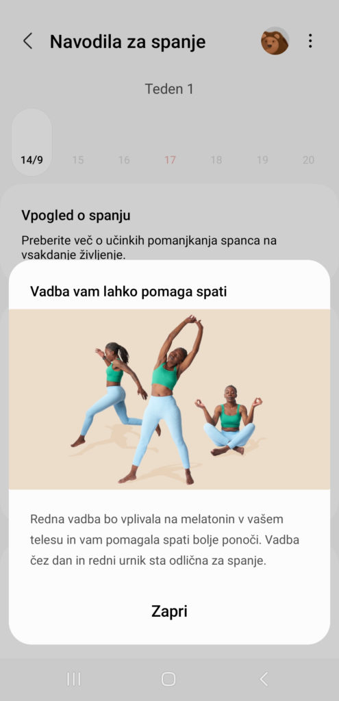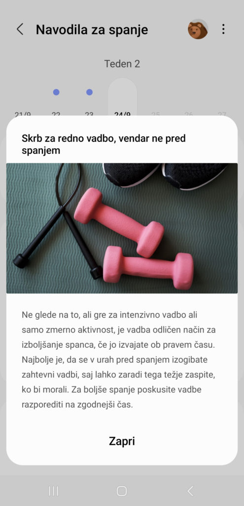Zadnja nadgradnja funkcionalnosti sledenja spanju je spalni trener (Sleep Coaching). Tega Samsung na urah Samsung Galaxy Watch6 Classic in Samsung Galaxy Watch6 ponuja brezplačno. Naše spalne navade se namreč razlikujejo, zato morajo biti nasveti za izboljšanje spanja prilagojeni posamezniku. Saj sicer ne dosežejo želenega učinka. Spalni trener, ki je del Samsung Health aplikacije, najprej potrebuje teden dni, da določi t.i. spalno žival posameznika. Nato pa skozi serijo nasvetov in priporočil s potisnimi obvestili posameznika spodbuja, da izboljša spalne navade.