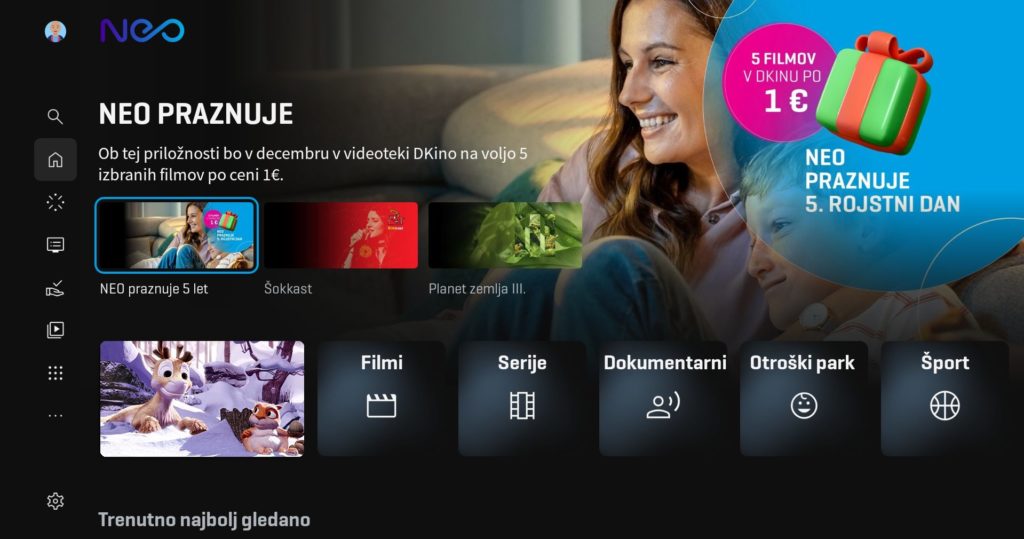 December je čas obdarovanj in druženj, zato NEO ob svoji peti obletnici naročnikom podarja dodatne televizijske vsebine za vso družino. Pri tem smo še posebej veseli, da smo v ta družinski krog lahko letos prvič vključili tudi naše kosmatince, ki sta jim na voljo dva TV-kanala, ustvarjena posebej zanje. Praktično brezhibno glasovno upravljanje v slovenščini, prenovljen in nadgrajen uporabniški vmesnik, ki zagotavlja vrhunsko uporabniško izkušnjo, in izredno bogat izbor TV-vsebin so osnova za to, da svojim naročnikom samozavestno in brezkompromisno garantiramo zadovoljstvo. NEO praktično nima konkurence v slovenskem prostoru in ko ga preizkusiš, to preprosto veš.