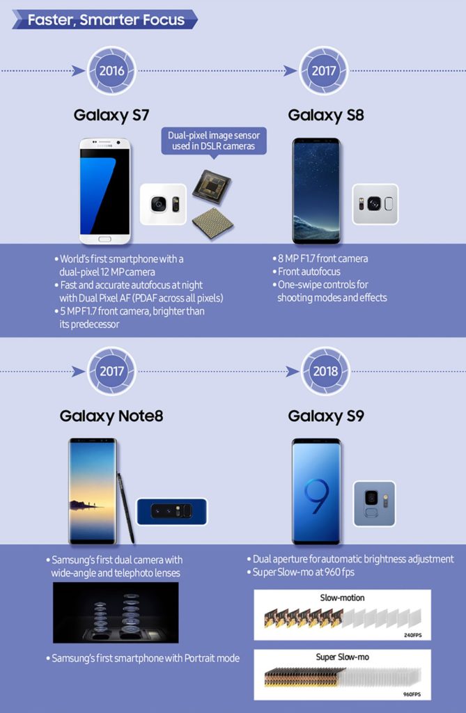 Z modelom Galaxy S7 je Samsung uvedel senzor Dual Pixel, poznan iz DSLR-fotoaparatov, ki je močno izboljšal hitrost ostrenja in zmogljivost pri šibki svetlobi. To je bil prelomni trenutek, saj je kamera pametnega telefona prvič dosegla raven, primerljivo s profesionalnimi napravami. Galaxy Note8 je nato prinesel dvojno glavno kamero, kar je uporabnikom omogočilo večji nadzor nad globinskim učinkom in perspektivo. Takrat se je začel trend sistema večih kamer, ki je postal standard v celotni industriji in omogočil nove oblike ustvarjalnosti. Vse od portretne fotografije do snemanja videoposnetkov v kinematografski kakovosti.