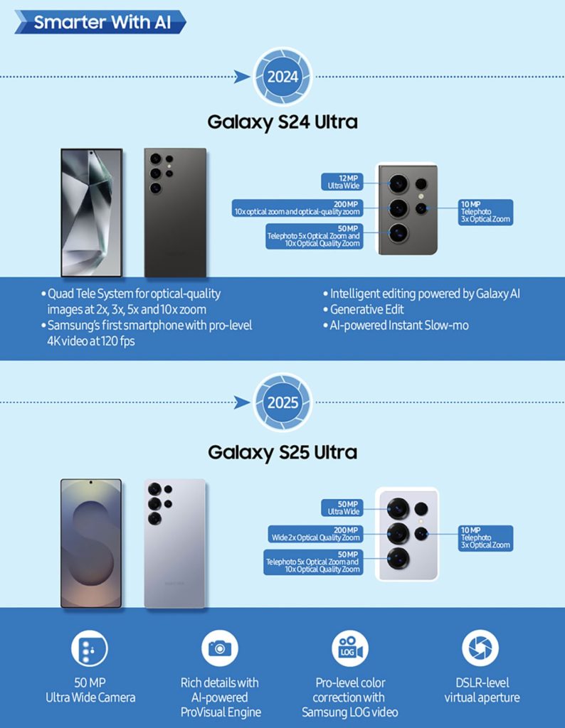 Zgodba Galaxy kamer se je začela leta 2010, ko je Samsung v svoj prvi model vgradil kamero s petimi milijoni slikovnih pik. Danes pa najnovejši Galaxy S25 Ultra prinaša glavni senzor z ločljivostjo 200 milijonov slikovnih pik in vrsto naprednih funkcij, ki so podprte z umetno inteligenco (AI). Prehod iz osnovnih funkcij v sofisticirane fotografske sisteme je eden najbolj opaznih tehnoloških razvojnih skokov v zgodovini mobilnih naprav.
