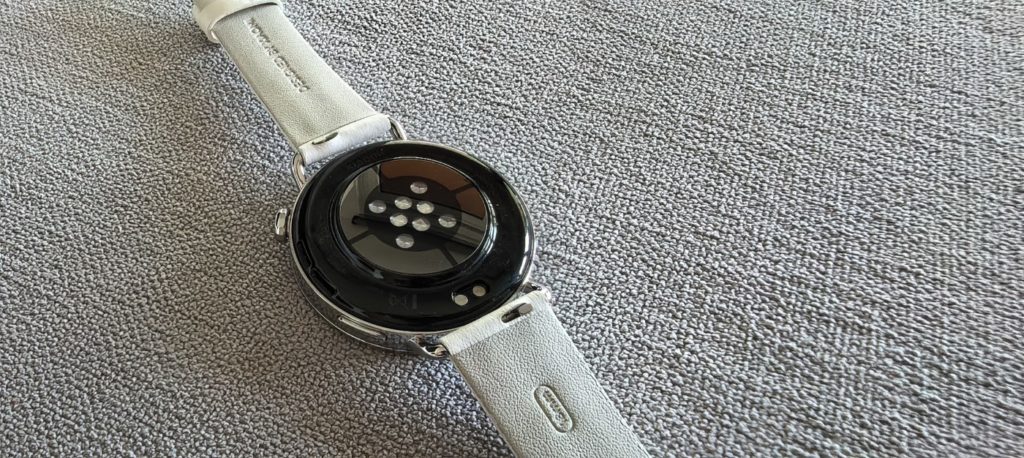 Pri ergonomiji Xiaomi ponovno dokazuje, da zna združiti obliko in funkcijo. Na desni strani ohišja se nahajata dva fizična elementa. Stranski gumb in rotirajoča krona, ki omogoča hitro pomikanje po menijih in izbiranje funkcij brez stalnega dotikanja zaslona. Hrbtni del ure je rahlo zaobljen, kar izboljša stik s kožo in omogoča natančnejše merjenje podatkov s senzorjev. Na tem delu se nahajajo optični senzorji za merjenje srčnega utripa in saturacije kisika. Zamenljivi paščki omogočajo personalizacijo videza. Na testu je bila različica z belim usnjenim paščkom. Tisti, ki iščejo še več elegance, pa bodo zagotovo izbrali zlato različico z milanskim kovinskim paščkom.
