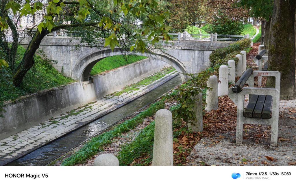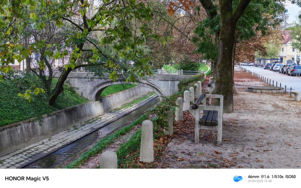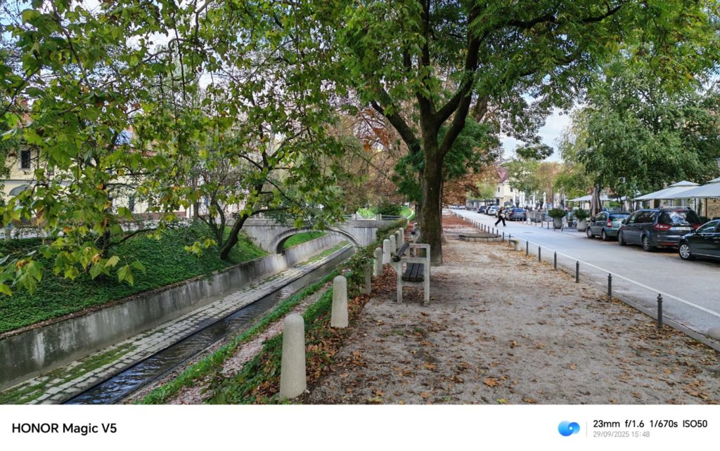Honor Magic V5 se lahko pohvali z enim najnaprednejših fotografskih sistemov med prepogljivimi telefoni, saj združuje trojno zadnjo kamero s 50 MP glavno, 50 MP ultraširoko in 64 MP telefoto lečo s 3× optičnim zoomom. Glavni senzor Sony IMX906 z optično stabilizacijo slike (OIS) in laserskim samodejnim ostrenjem deluje odlično v vseh svetlobnih pogojih. Fotografije so ostre, barvno uravnotežene in ohranjajo naraven kontrast brez pretiranega digitalnega obdelovanja.