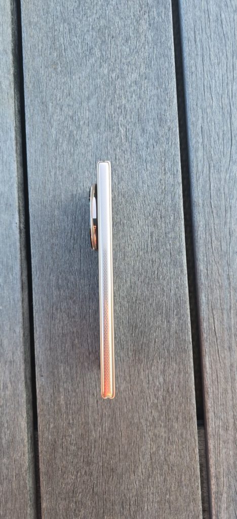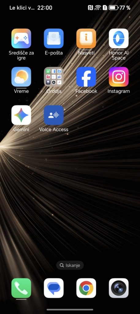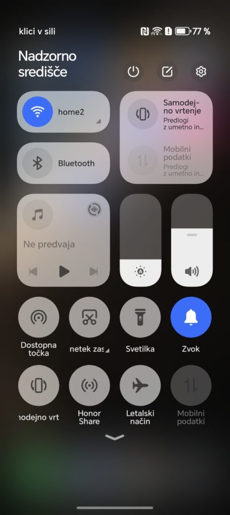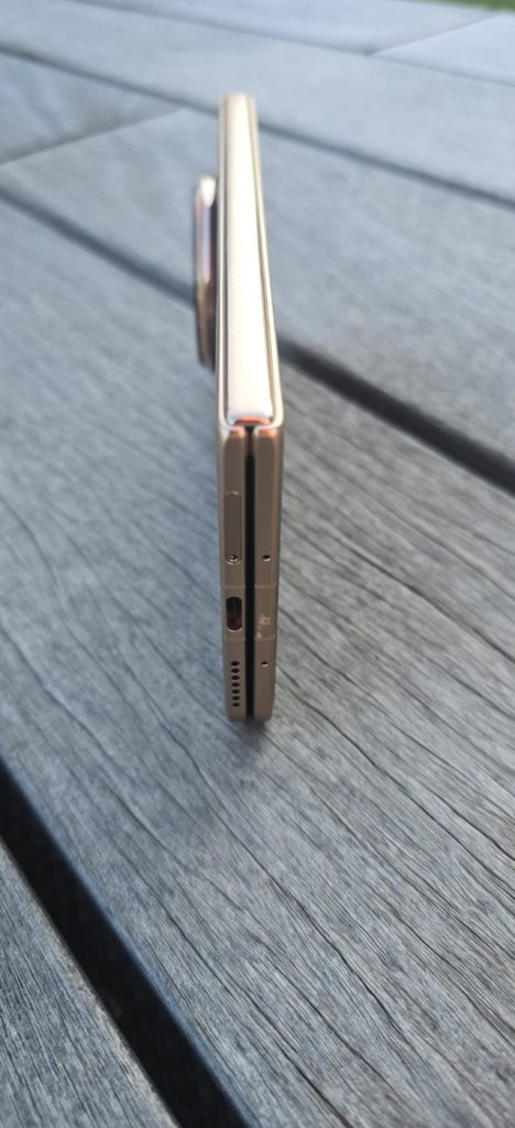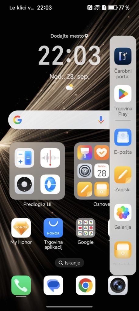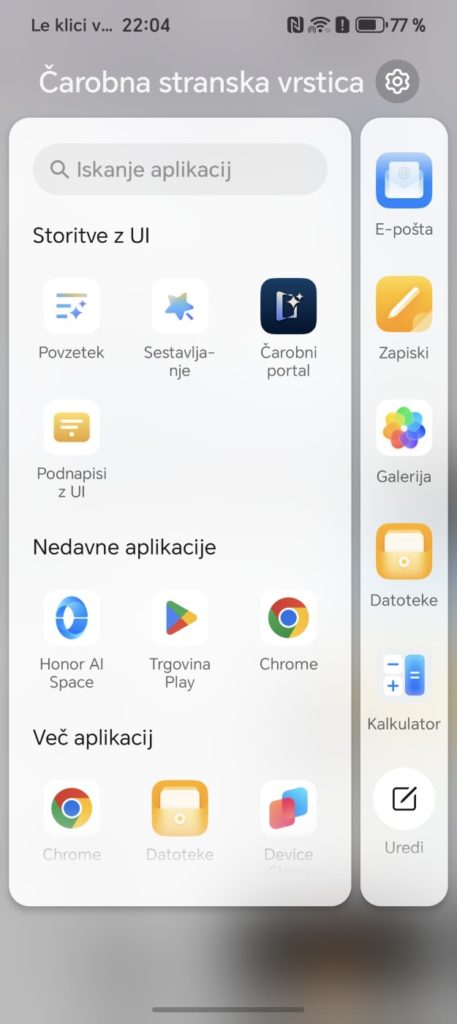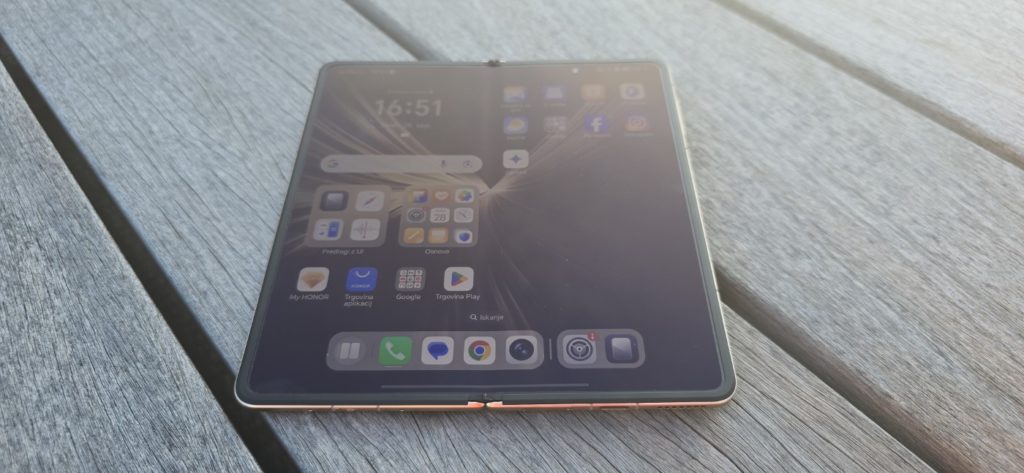 Honor navaja, da tečaj prenese do 500.000 ciklov prepogibanja. To bi v praksi pomenilo več let brez zaznavne obrabe. Tudi občutek v roki izstopa. Teža 217 gramov je razporejena uravnoteženo, zato telefon ne daje vtisa krhkosti. Zapiranje spremlja tih, zadovoljivo trden “klik”, ki potrjuje mehansko kakovost zasnove. Pri zloženem stanju Magic V5 deluje kot kompakten klasični telefon z razmerjem 20:9, medtem ko se ob razprtju razširi v skoraj kvadratni format, ki omogoča naravno razporeditev vsebine, primerljivo z majhnim tabličnim računalnikom.