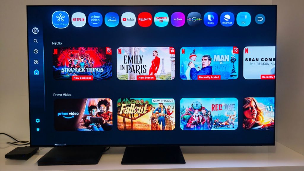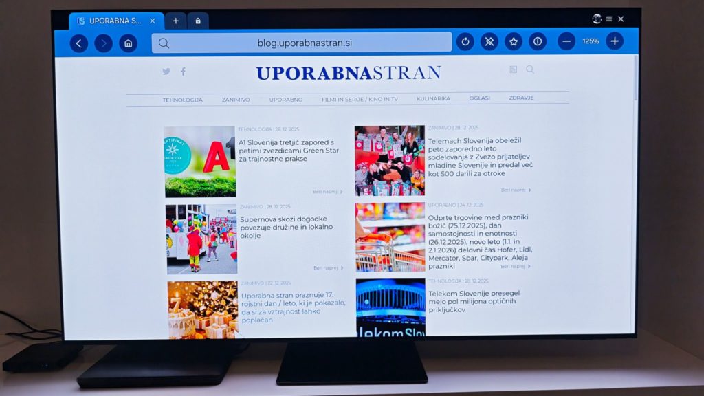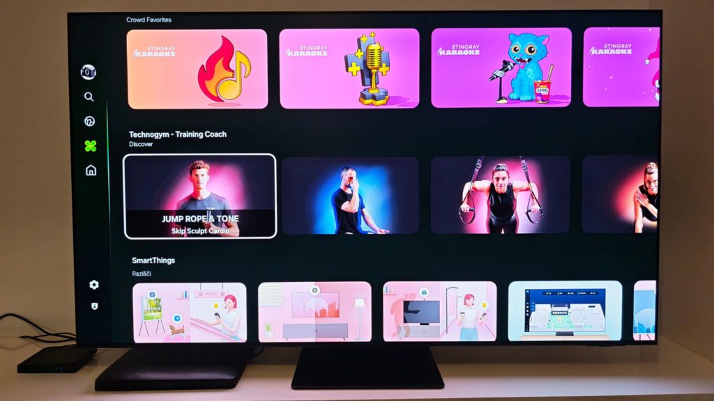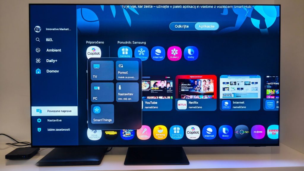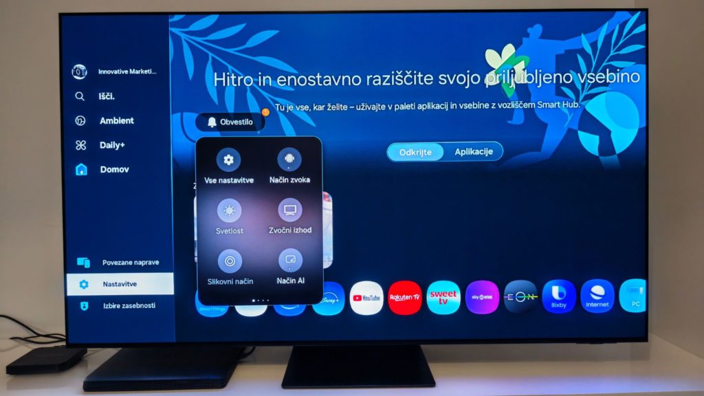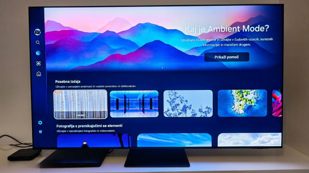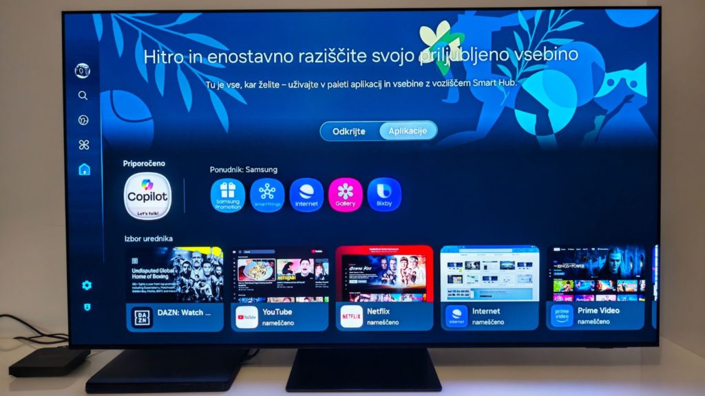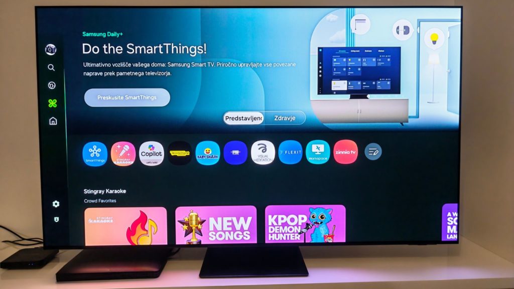 Samsung OLED S95F uporablja One UI Tizen OS (Tizen 9.0). V primerjavi s prejšnjimi generacijami Tizena je vmesnik bolj konsistenten, hitrejši in tesneje povezan s storitvami, ki jih televizor uporablja vsakodnevno. Delovanje sistema je tekoče, brez opaznih zakasnitev pri odpiranju aplikacij, preklapljanju vhodov ali dostopu do podnastavitev. Zelo pohvalno je, da Samsung za to generacijo televizorjev obljublja do sedem let nadgradenj sistema One UI Tizen. To ne pomeni le varnostne popravke, ampak tudi funkcionalne nadgradnje vmesnika in pametnih funkcij. To pa je pri televizijah, ki pogosto ostanejo v uporabi več kot desetletje, realna dodana vrednost.