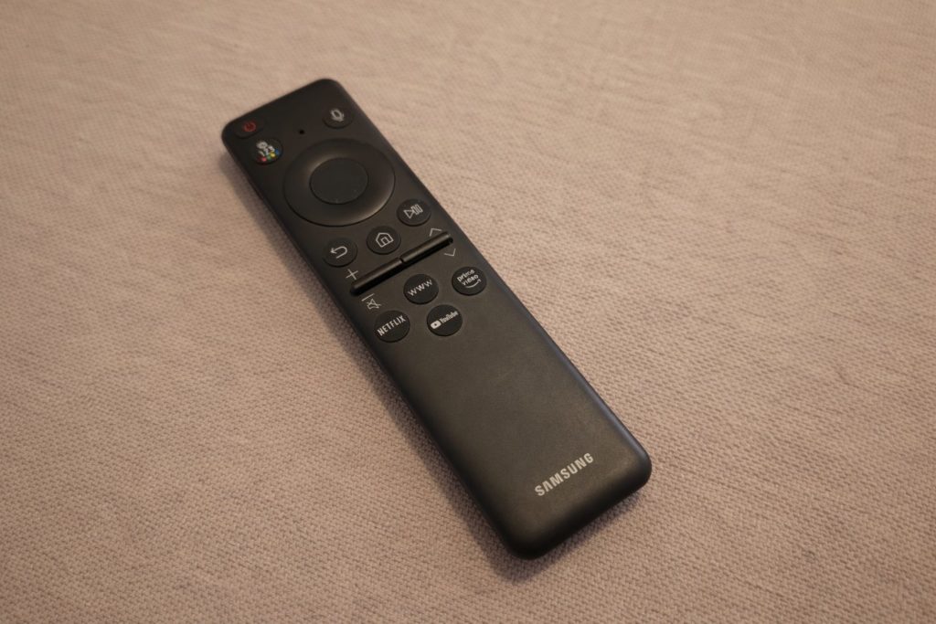 Daljinski upravljalnik ostaja ena bolj prepoznavnih Samsungovih rešitev. Gre za kompakten, minimalistično oblikovan daljinec s solarnim polnjenjem. Na tak način je Samsung korenito zmanjšal potrebe po polnjenju daljinca. Če pa se zgodi, da je to vseeno potrebno, pa je na voljo USB-C vhod. Ergonomija daljinca je dobra, tipke so smiselno razporejene, odzivnost pa natančna. Prisotne so tudi bližnjice do izbranih pretočnih storitev, kar pospeši vsakodnevno uporabo, čeprav nekoliko zmanjša univerzalnost zasnove, saj bi nekdo drug morda izbral nekatere druge aplikacije, ki so mu ljubše.