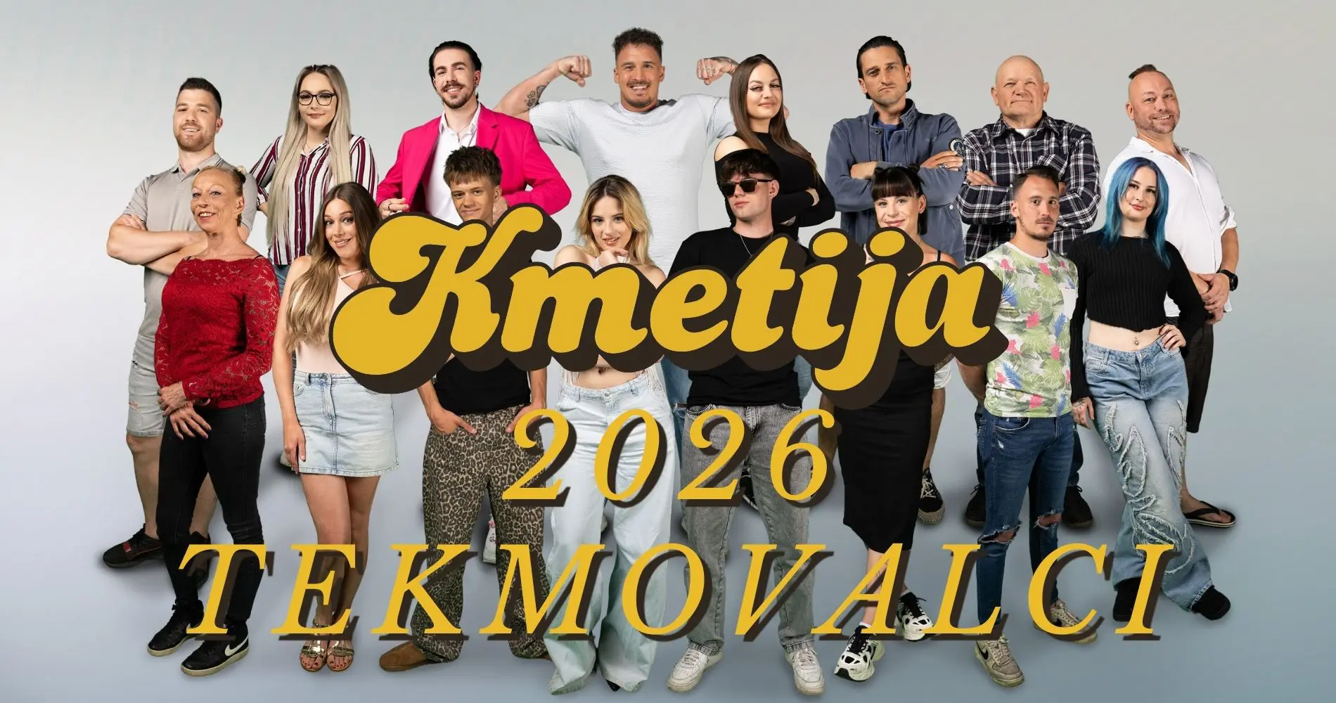 Tekmovalci šova Kmetija 2026 bodo: Pia Filipčič, Franc Vozel, Nuša Šebjanič, Dino Kurtović, Juš Čop, Mark Baržić, Alenka Weiss, Jan Zore, Žan Zore, Lana Pečnik, Dejan Guzej, Urška Gros, Gregor Merdaus, Aleksandra April, Ema Dragišić in Žiga Florjan Sedevčič.